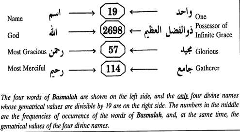 Professor Cesar Majul looked at the gematrical value of more than 400 attributes of God, and found only four names whose gematrical vaues are multiples of 19: